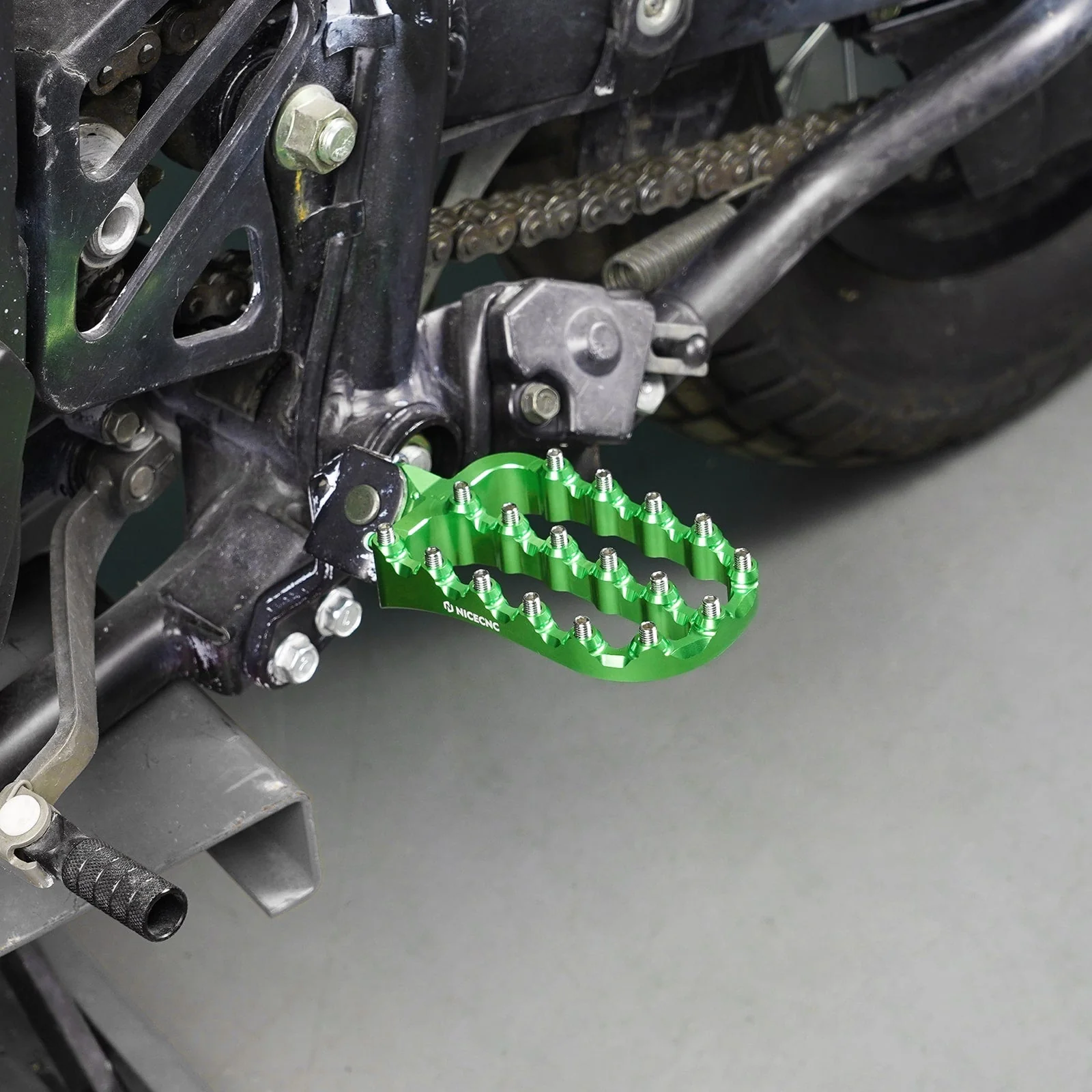 - 1" Tieferlegung – Dieses neue Fußrastentieferlegungsset senkt die Position Ihrer KLR650-Fußrasten um 1" (25,4 mm) ab und verschiebt sie gleichzeitig um 0,197" (5 mm) nach hinten, was für mehr Komfort sorgt, egal ob Sie auf ebenen Straßen oder in unebenem Gelände fahren.