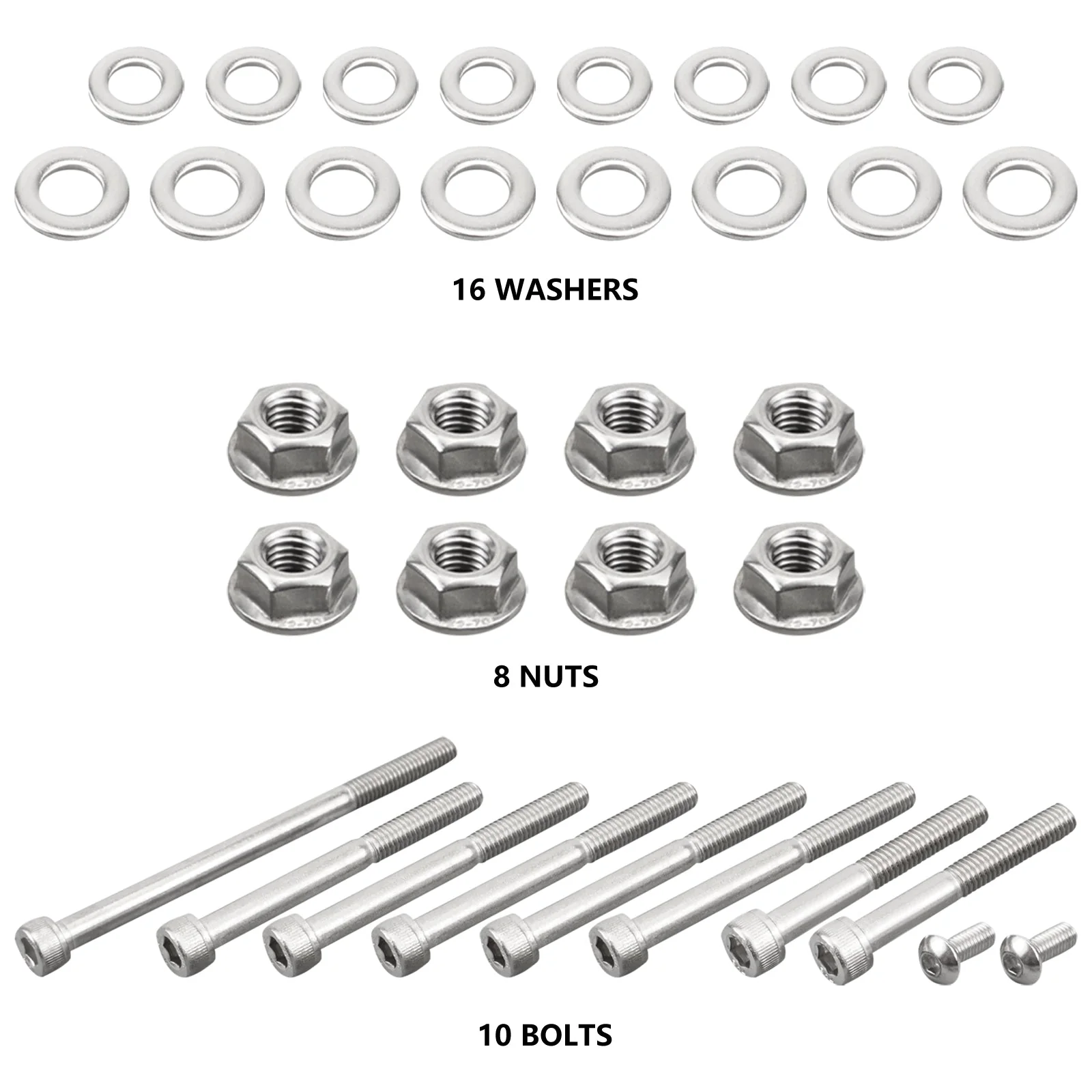 10 Schrauben, 8 Muttern und 16 Unterlegscheiben
