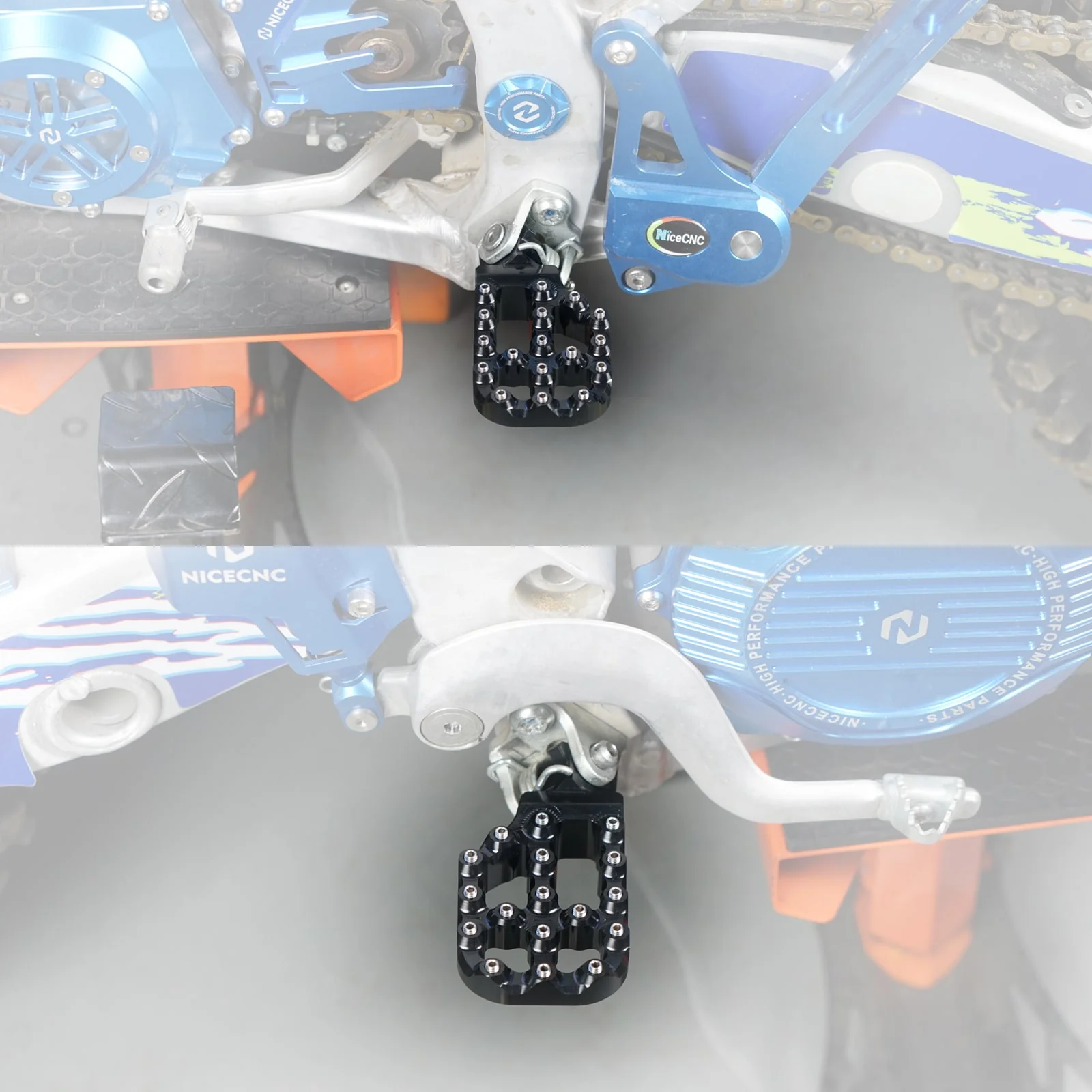 Positionseinstellung – Die Fußstützenposition ist im Vergleich zur Originalfußraste 12 mm nach unten und 10 mm nach hinten versetzt. Dieses versetzte Design hilft Fahrern, das Motorrad während der Fahrt besser auszubalancieren, insbesondere wenn eine präzise Kontrolle erforderlich ist oder wenn komplexes Gelände zu bewältigen ist, und sorgt für eine stabilere Fahrhaltung.